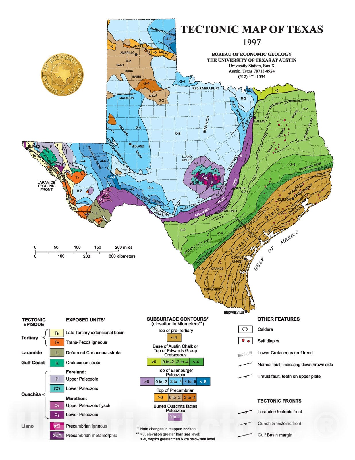 Map : Tectonic Map of Texas, 1997 Cartography Wall Art