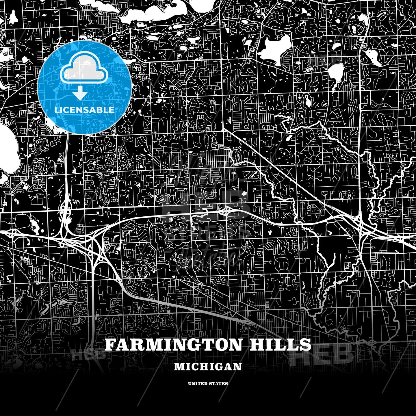 Black map poster template of Farmington Hills, Michigan, USA
